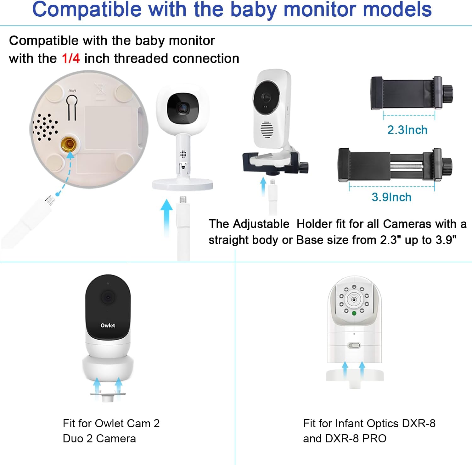 This baby monitor floor stand is compatible with Infant Optics DXR-8 Pro, Nanit Pro, Motorola, VAVA, Owlet, Owlet Cam 2 And also fit other baby cameras with standard 1/4 threaded hole (NOTE:The Baby monitor is not included)