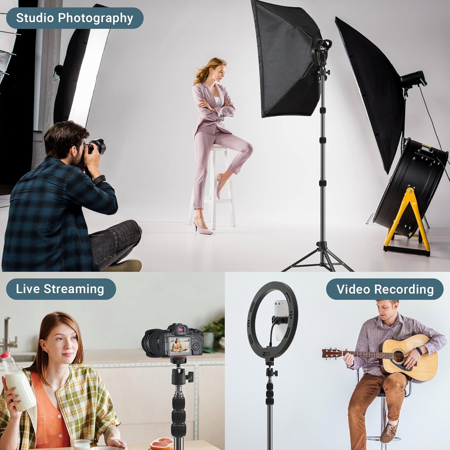 【Easy to use & Lightweight】 The lightweight tripod is easy to use. It can be quickly set up and adjusted without tools. Weighing about 545g/1.2lb (similar to two phones), it’s easy to carry whether traveling or recording in the studio or outdoors