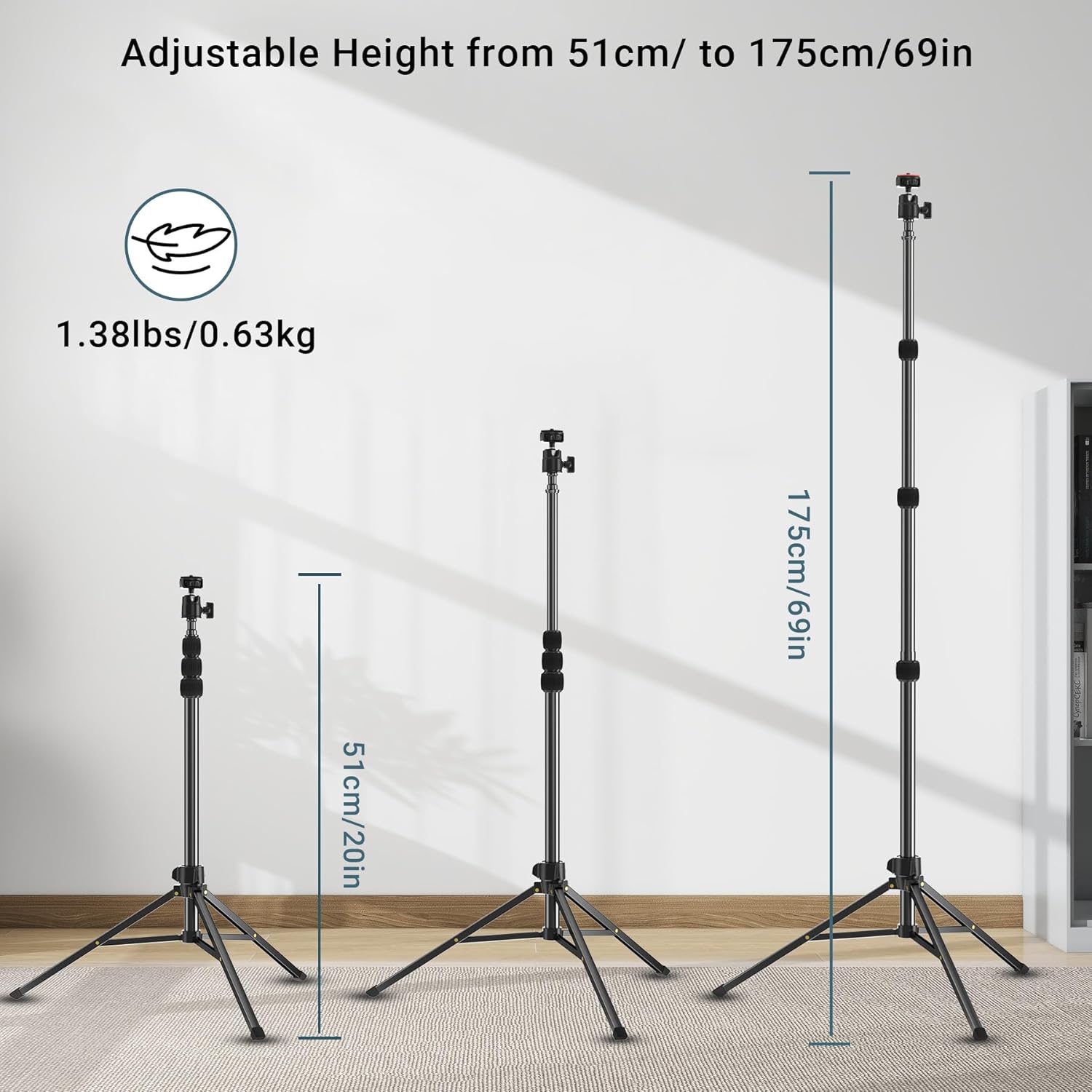 【Adjustable Height】The adjustable height of the tripod ranges from 20in/51cm to 69in/175cm. You can adjust the height flexibly according to the shooting. Whether you need a low-angle shot or a high-angle view, the stand can be easily adjusted to meet your needs
