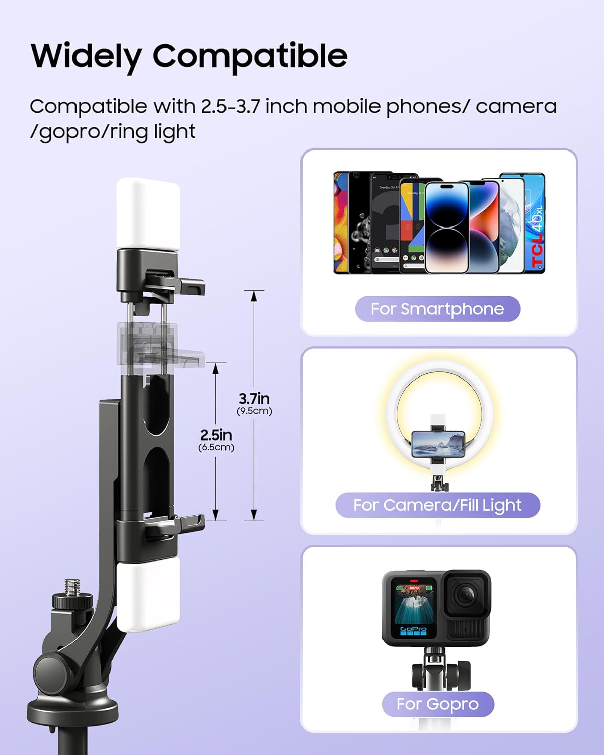 FlexibleTripod for iPhone: This selfie stick tripod can rotate 360° left and right, and flip 180° front and back. The adjustable height of the cell phone tripod is 8.5~53”, allows you to find the best angle. The phone holder clamp is adjustable to fit most smartphones (2.5-3.7” in width)