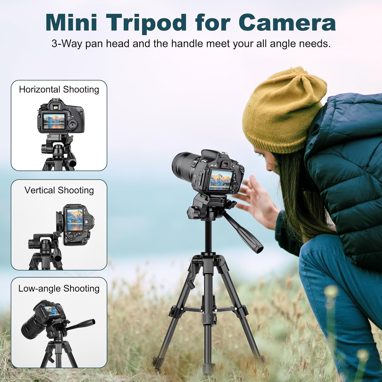 【Versatile Shooting Angles】Phone camera tripod is equipped with a stable and smooth 3-way pan head, giving you a flexible shooting experience. Compact tripod for camera supports horizontal, vertical, overhead and 360° panoramic shooting, achieving multi-angle shooting and capturing moments with ease.