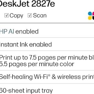 | Included Components | HP DeskJet 2827e All-in-One; HP 67 Setup Black Cartridge; HP 67 Setup Tri-color Cartridge; Regulatory flyer; Setup guide; Reference guide; Power cord [For ink volume and page yield information, visit http://hp.com/go/learnaboutsupplies ] |